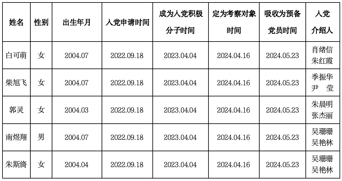 经支委会研究,拟定于2025年5月22日召开党员支部大会,对预备党员白可萌等5名同志转为中共正式党员进行讨论,望广大师生予以监督。如不符合转正条件,请在公示之日起七天内向本支部或上级党委举报,并提供必要的证据。反馈电话:83803652。